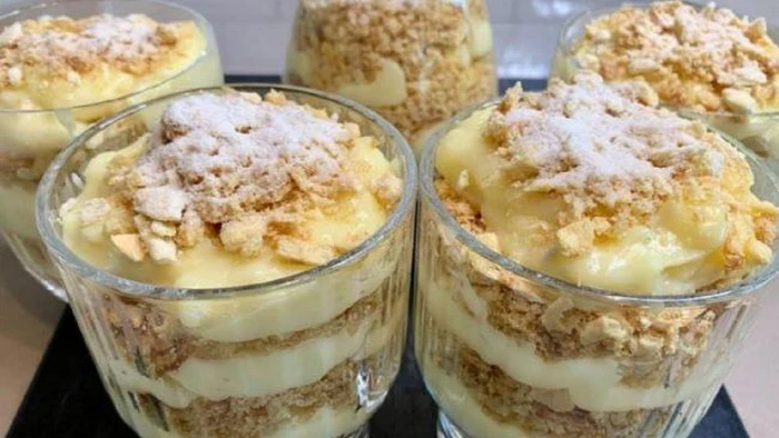 Desert se može jesti odmah dok su kolačići hrskavi ili ostaviti u hladnjaku 30 minuta da se prožmu.