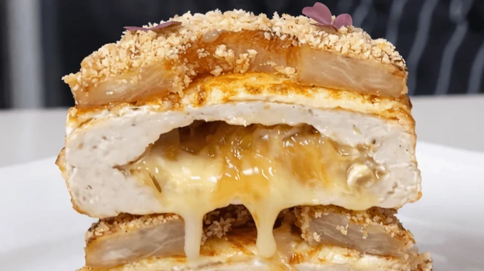 Francuski kotlet je klasik koji poznaje gotovo svaki gurman, ali što ako mu dodate malo modernog šarma. Tajna chefa Aleksandra Ogorodnika je sloj karameliziranog luka i kolut ananasa, koji čini jelo ne samo sočnim, već i svijetlim okusom i izgledom. U kombinaciji s hrskavom korom od sira i majoneze, ovaj kotlet postaje pravo gastronomsko remek djelo.