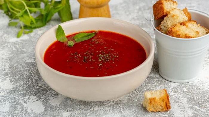 - Po želji, svaki tanjur nadjenite krutonima i začinskim biljem. Ova juha ispada vrlo lijepe bogate crvene boje i sigurno će se svidjeti djeci.