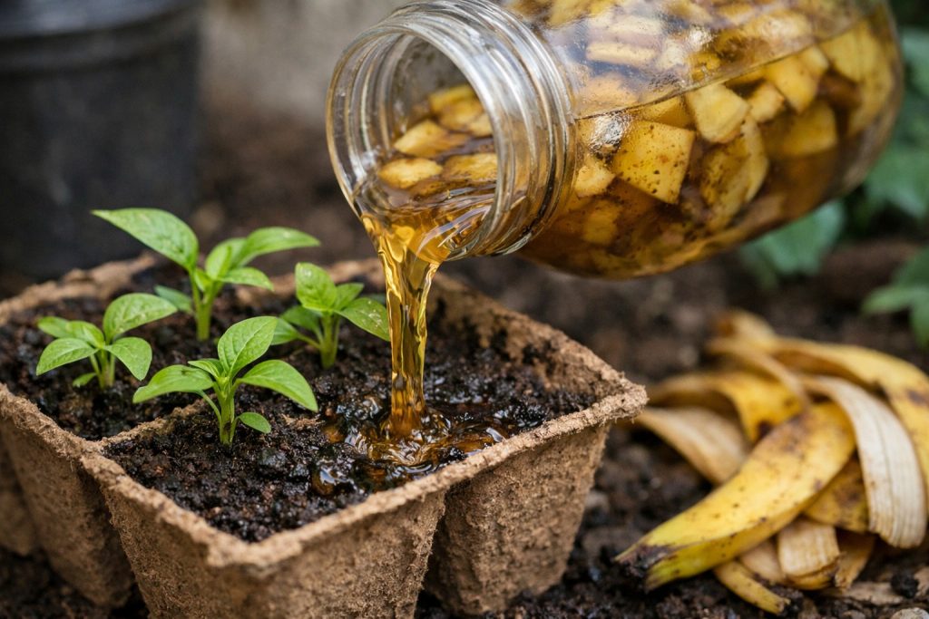 Infuzija kore banane je najpristupačniji i ekološki prihvatljiviji način pripreme sadnica za presađivanje na stalno mjesto. Redovito zalijevanje ovim sredstvom jednom u dva tjedna značajno ubrzava razvoj zelene mase i čini biljke otpornima na promjene temperature.