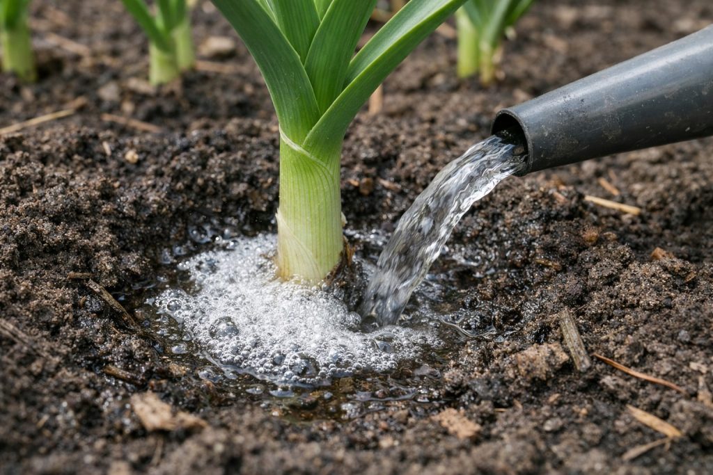 Pratite vlažnost; češnjak ne podnosi sušenje tijekom formiranja glave.