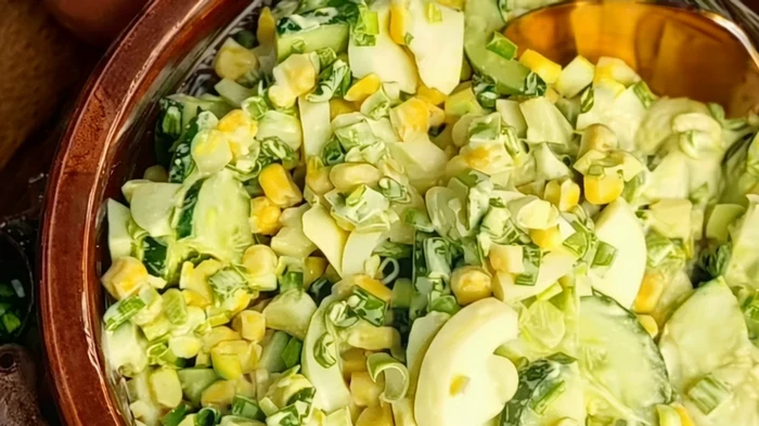 - U velikoj zdjeli za salatu pomiješajte sve sastojke: jaja, krastavac, kukuruz i luk.