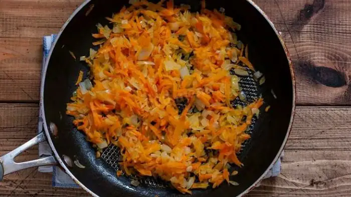 - Koliko dugo pržiti luk? Otprilike 5-7 minuta dok ne porumene i ne omekšaju. Zatim gotovo gotovom luku dodajte naribanu ili sitno nasjeckanu mrkvu.