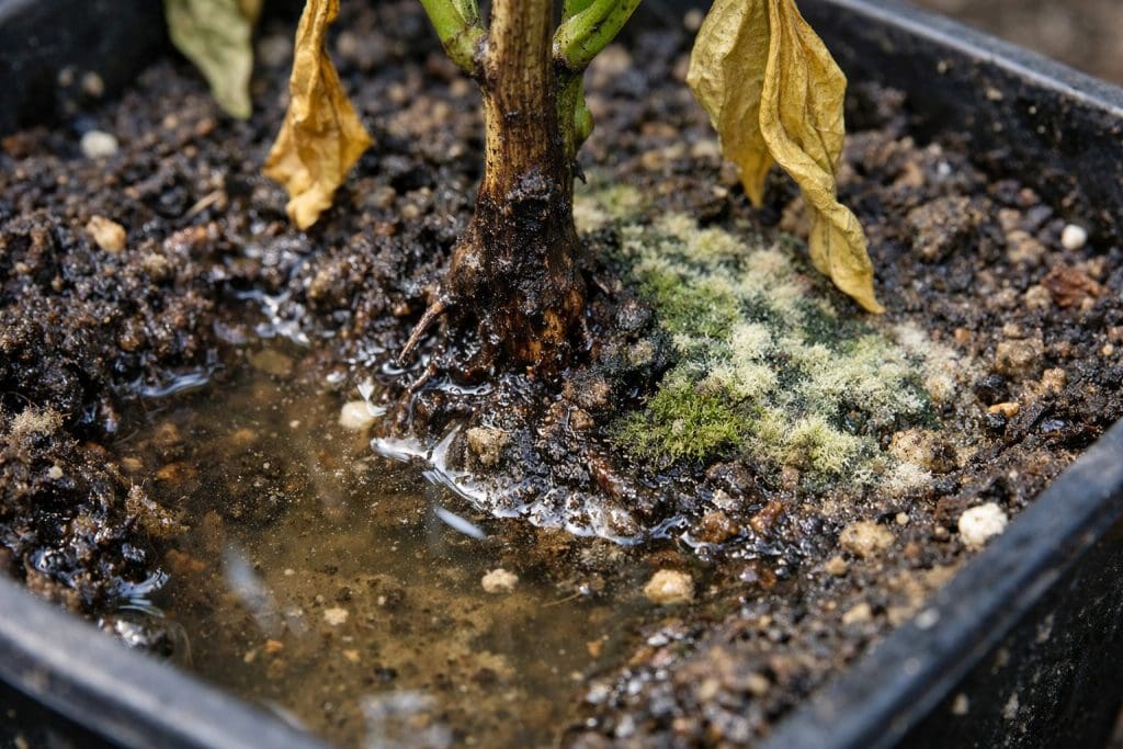 Stabljika u podnožju postaje mekana ili potamni.