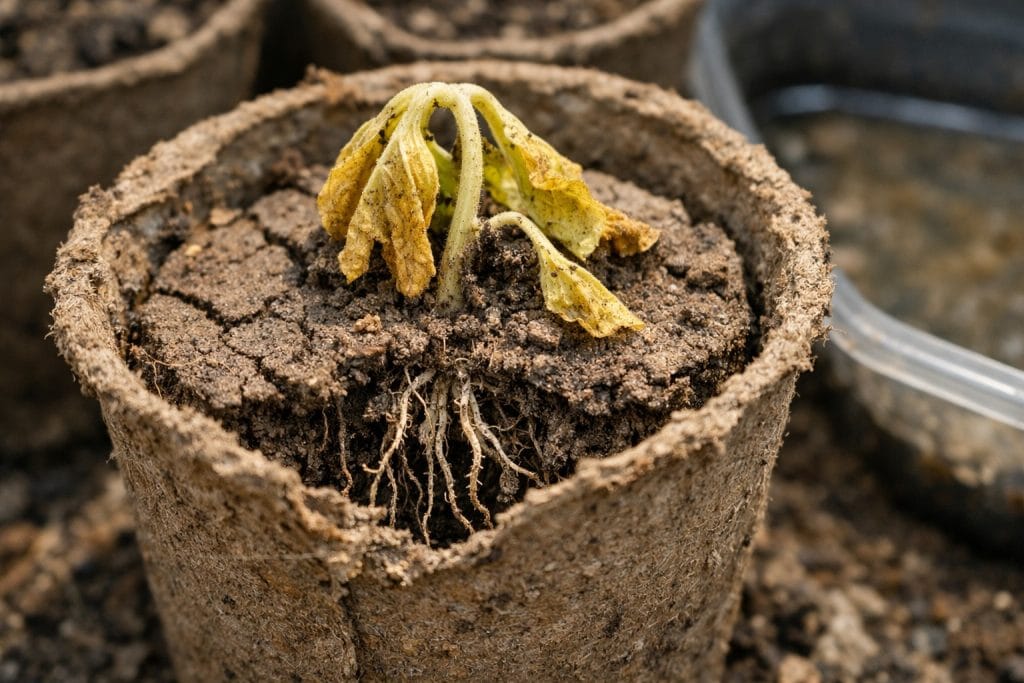 Većina komercijalnih posuda sastoji se od komprimiranog treseta s dodatkom kartona. Ovaj materijal ima izuzetno visoku higroskopnost. Čim se vanjska okolina osuši, zidovi čaše počinju izvlačiti vlagu iz zemljane grumene, doslovno isušujući nježno korijenje krastavca.