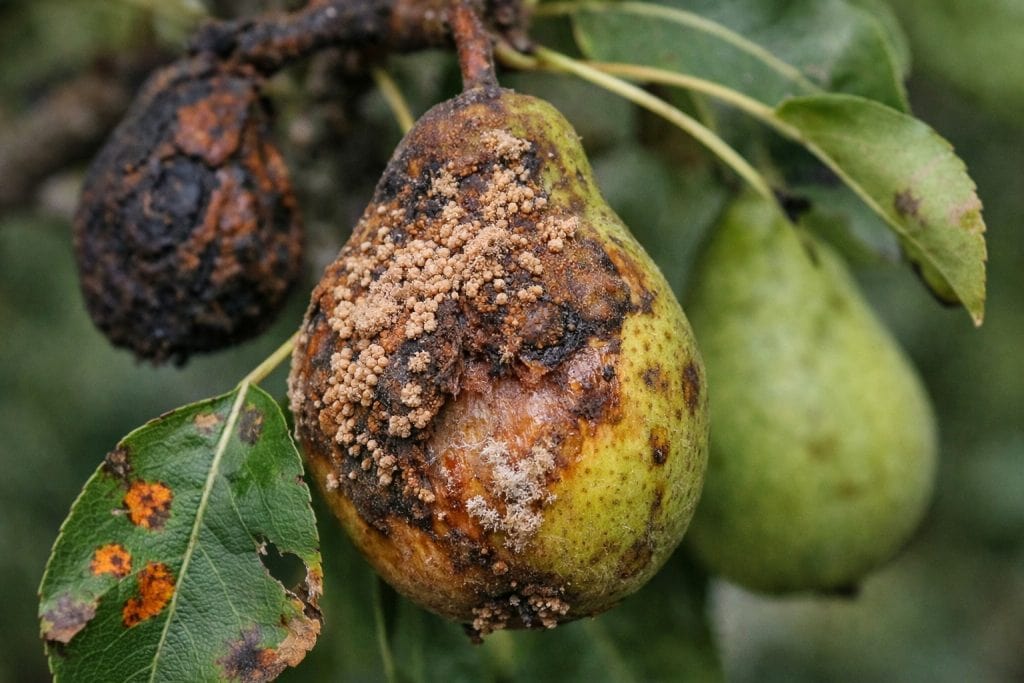 Glavni neprijatelj koji se često zaboravlja je hrđa od kruške. Ova gljivična bolest prenosi se s borovice i uzrokuje da stablo troši sve svoje resurse na preživljavanje, a ne na proizvodnju plodova. Ako početkom ljeta primijetite jarko narančaste mrlje na lišću, znajte da sljedeće godine bez hitnog tretmana neće biti plodova. fungicidi.