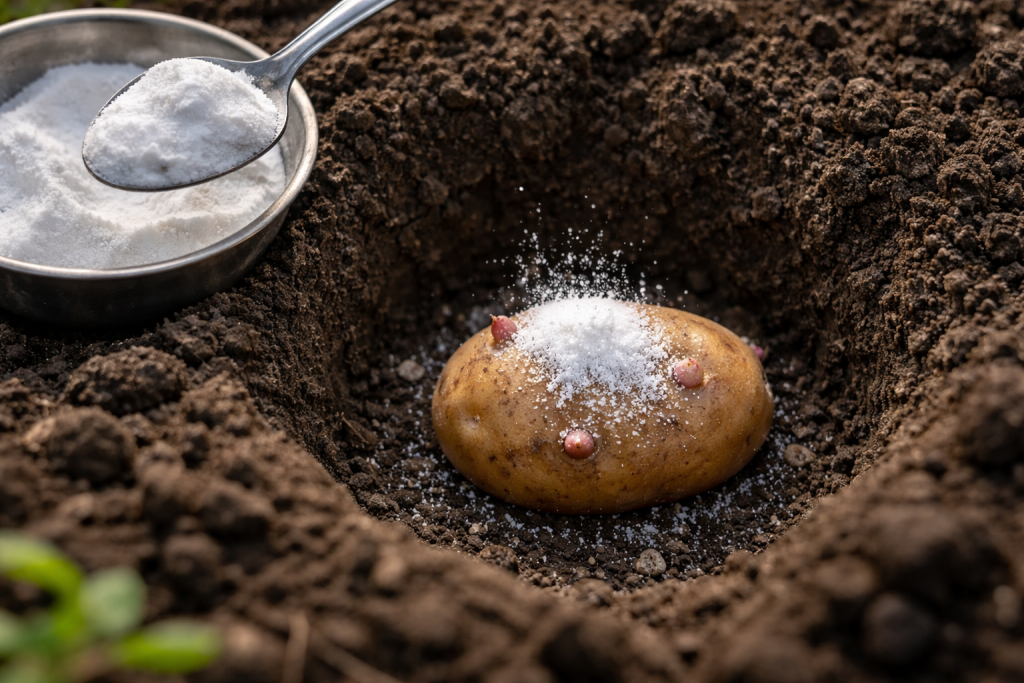 Važno je sodu lagano pomiješati sa zemljom kako ne bi došlo do izravnog agresivnog kontakta s mladom kožicom gomolja.