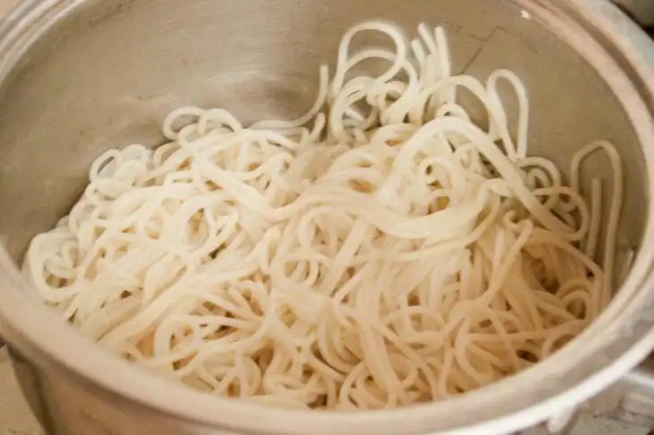 - U šerpu prosijte brašno, ulijte 100-150 mililitara vode i miješajte pjenjačom da nema grudica, zatim ulijte preostalu vodu i ponovno promiješajte dok ne postane glatko.