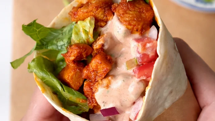 - Stavite zelenu salatu, piletinu, rajčice i luk u sredinu svake tortilje i obilato prelijte umakom.