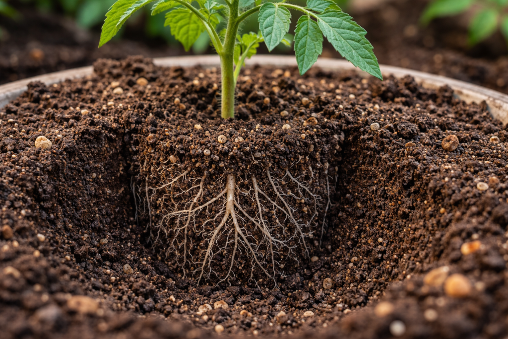 Moja provjerena metoda: ako kada pritisnete zemlju u čaši, vaš prst ne potone, već odskoči, to je idealna gustoća. U takvim uvjetima rajčica formira snažan kostur koji može izdržati svaki vjetar na otvorenom terenu.