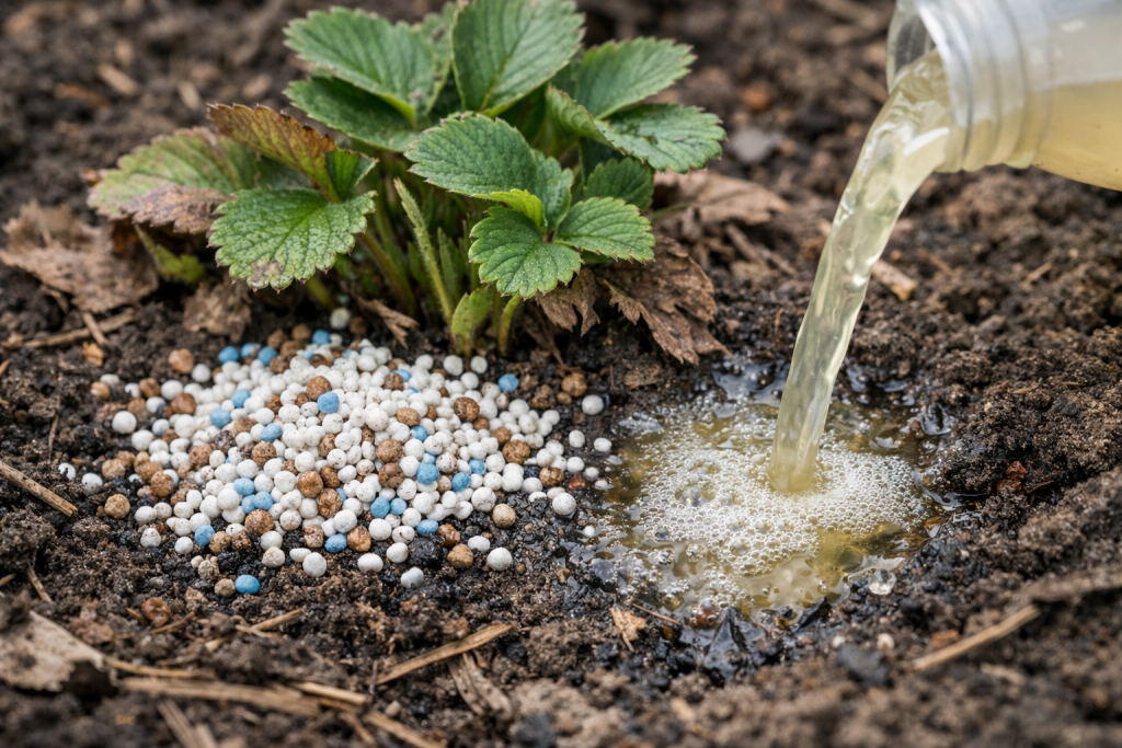 Čim se zemlja zagrije, jagodama nije potreban čisti dušik, već stimulacija korijenskog sustava. Ako se korijenje ne probudi, svaka gnojidba će ići u duboke slojeve tla bez uspjeha.