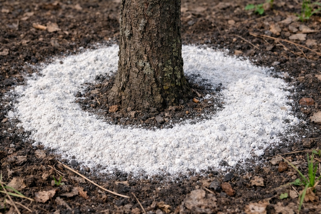 Prskanje duž projekcije krune. Jednostavna metoda je kada se brašno posipa po površini zemlje i lagano pokrije grabljama. Zahtijeva obilno zalijevanje ili oborine.