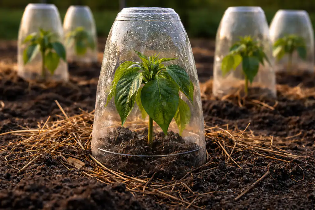 Tajna nijansa: ako paprika počne venuti odmah nakon sadnje, pokrijte svaku biljku običnim papirnatim poklopcem ili odrezanom plastičnom bocom bez poklopca dva do tri dana. To će stvoriti mikroklimu s visokom vlagom i smanjiti isparavanje kroz lišće dok se korijenje prilagođava.