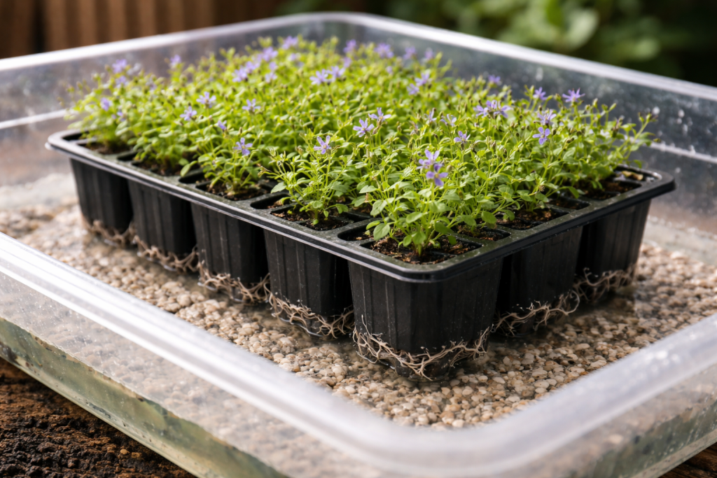 Pravilna ravnoteža vlage u ograničenom volumenu tla ključ je bujne cvatnje ljeti. Korištenje kapilarnog navodnjavanja i kontrole temperature zraka omogućuje očuvanje stopostotnih sadnica čak iu najmanjim kasetama. Podloga uvijek treba ostati umjereno vlažna na dodir.