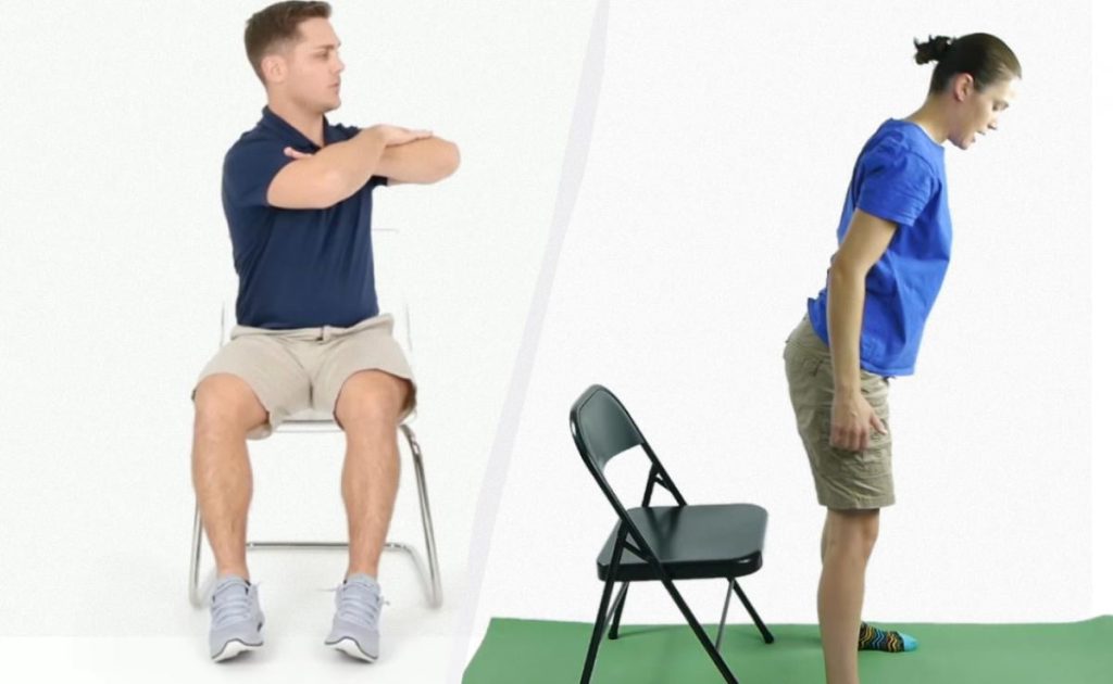 - Stanite ravno ispred čvrste stolice sa stopalima u širini kukova. Gurnite prsa prema naprijed.