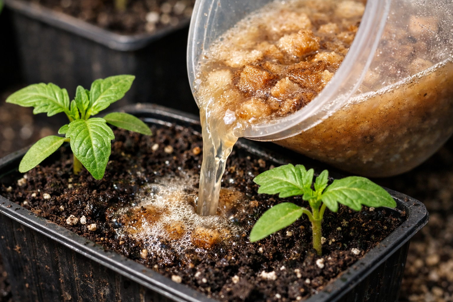 Ne, takav postupak je katastrofalan za proklijalo sjeme, jer će otopina spaliti izloženi korijen.