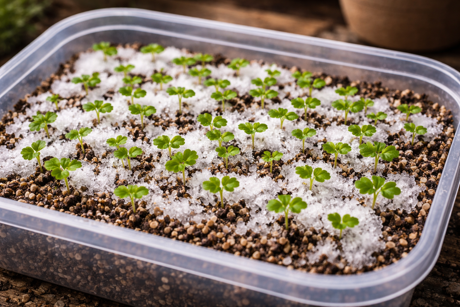Ali puno je lakše navlažiti komad prirodne tkanine, gazu, pamučne jastučiće ili debele papirnate salvete u pripremljenoj otopini. Tkanina se zatim stavlja na ravnu površinu, poput tanjurića. Sjemenke se polažu na vrh, prekrivaju drugim slojem tkanine i prozirnim polietilenom – vrećicom ili filmom. Nakon 3-5 dana, čim se sjeme izleže, odmah se sadi.