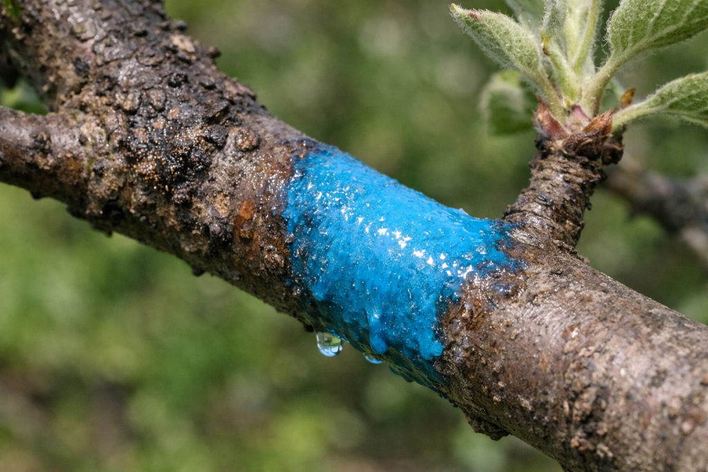 Zdrava kora stabla jabuke nakon proljetnog tretmana dobiva jedva primjetnu plavkastu nijansu.