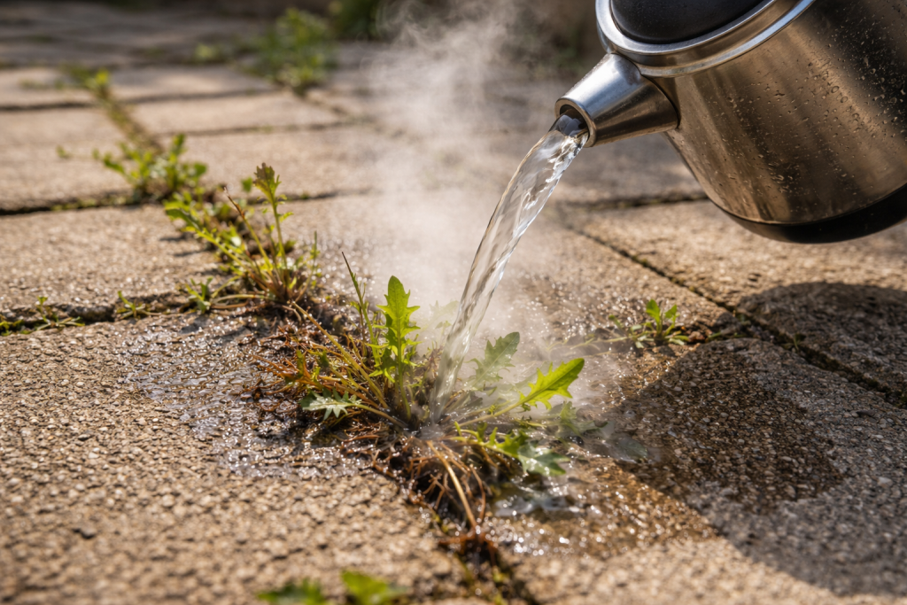 Snažna toplinska opekotina kipućom vodom savršeno ubija nadzemni dio i korijenje malih izdanaka, ali za velike trajnice poput maslačka, ovaj postupak morat ćete ponoviti nekoliko puta zaredom.