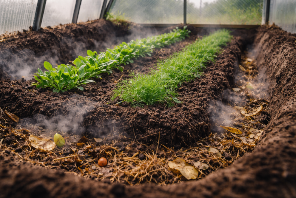 Da bi se tlo otopilo za nekoliko dana, potrebno je koristiti biogorivo. Prirodnom razgradnjom organske tvari oslobađa se toplina koja će zagrijati korijenje budućih biljaka i zaštititi ih odozdo.
