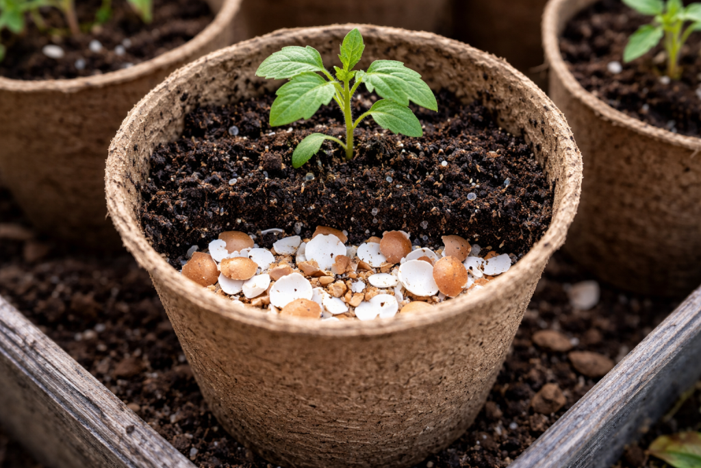 Ulijevanjem velikih fragmenata na dno čaša stvarate idealno okruženje za razvoj snažnih usisnih korijena. Zdrav korijenski sustav – jamstvo da se biljka brzo prilagođava nakon sadnje u vrtu.