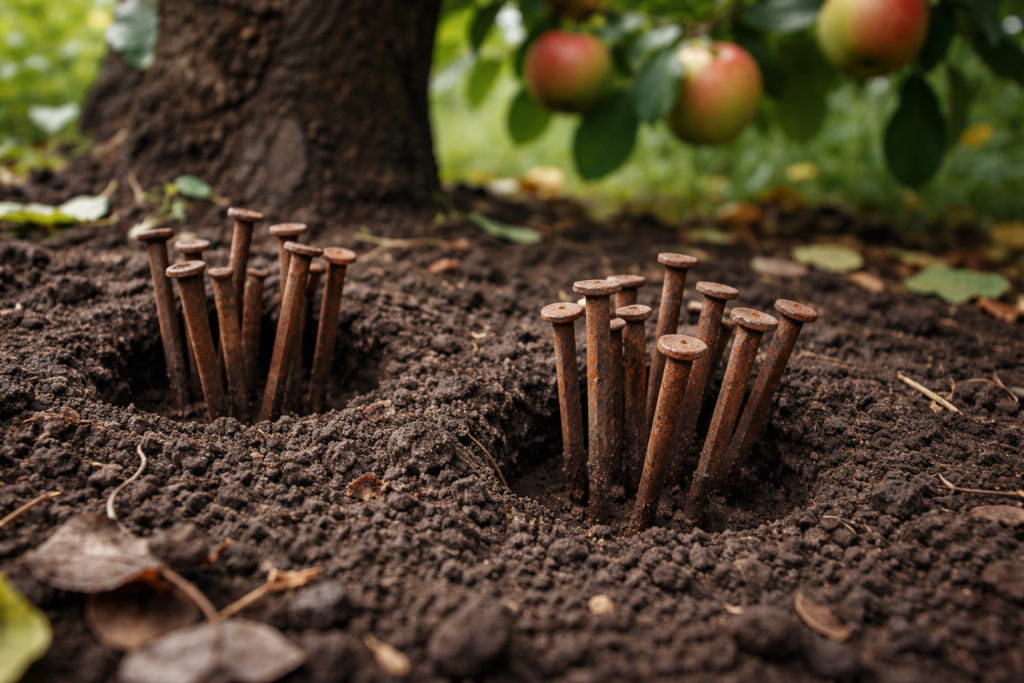Stabla jabuka često pate od klorozapodmukla bolest kod koje je obrazovanje poremećeno klorofil u lišću. Korijenje drveća ne može uvijek apsorbirati hranjive tvari iz tla, osobito ako je tlo pregusto ili alkalno. Kopanjem metalnih predmeta započinje proces postupnog oksidacija te kontinuirano otpuštanje dostupnih mikroelemenata u zonu korijena.