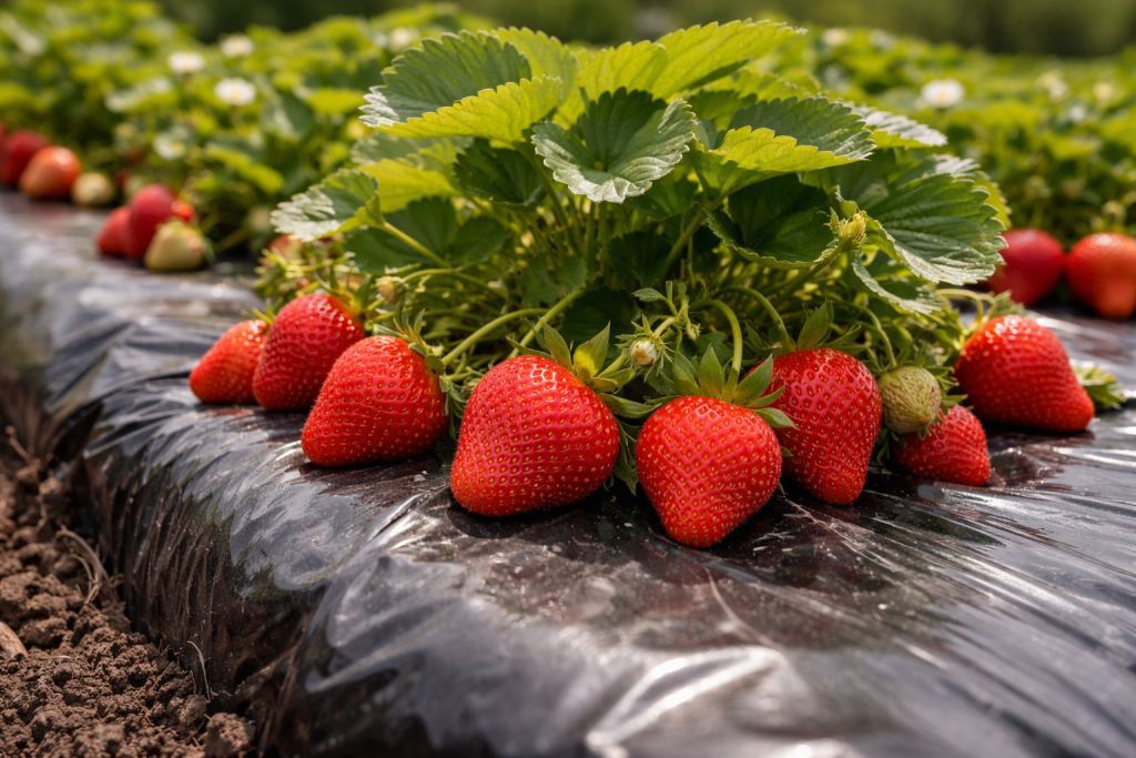 Preporuča se korištenje gustog dvobojnog polietilena, pri čemu je crni sloj okrenut prema dolje radi suzbijanja korova, a bijeli prema gore kako bi reflektirao višak sunca.