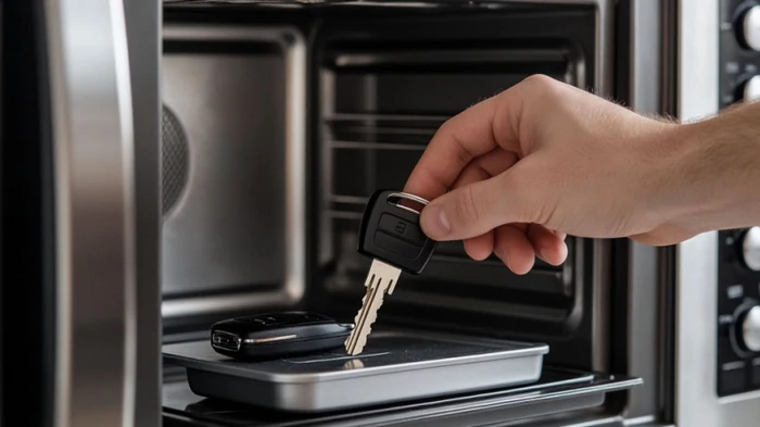Kada je mikrovalna pećnica isključena, ona se u biti ponaša kao Faradayev kavez – metalna struktura blokira radio signale. To sprječava lopove da “uhvate” signal ključa i prenesu ga u automobil.