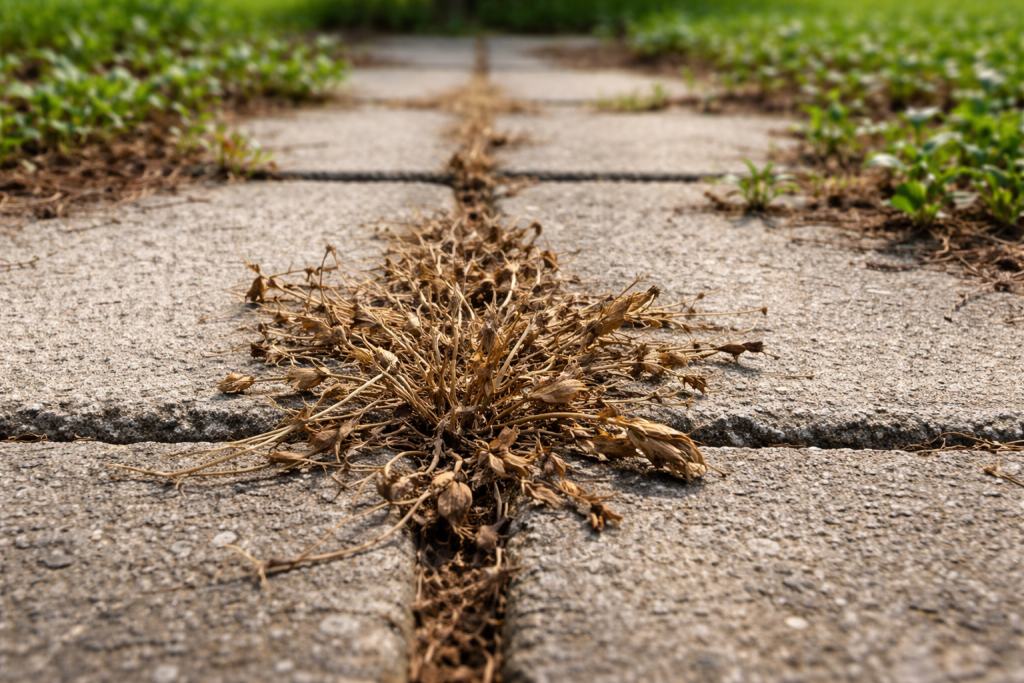 Najbrži način uklanjanja rasta između ploča ili na vrtnim stazama je korištenje koncentrirane kiseline prirodnog podrijetla. Obični stolni ocat uništava stanične membrane neželjenih klica, uzrokujući njihovo brzo sušenje.